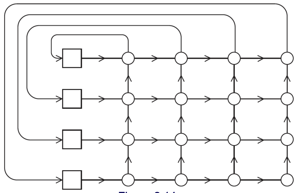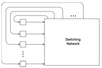 Their general shape is a group of processor-memory pairs with directed links entering a switching network and each processor is connected with one link coming out from the switch. Check Figure fig-indirect-network.
