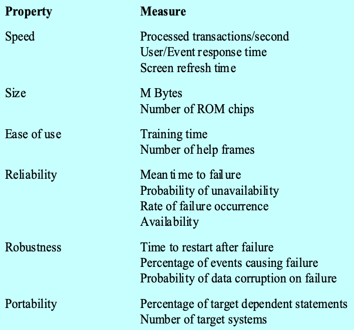 These define system properties and constraints e.g. reliability, response time and storage requirements. Constraints are I/O device capability, system representations, etc.
